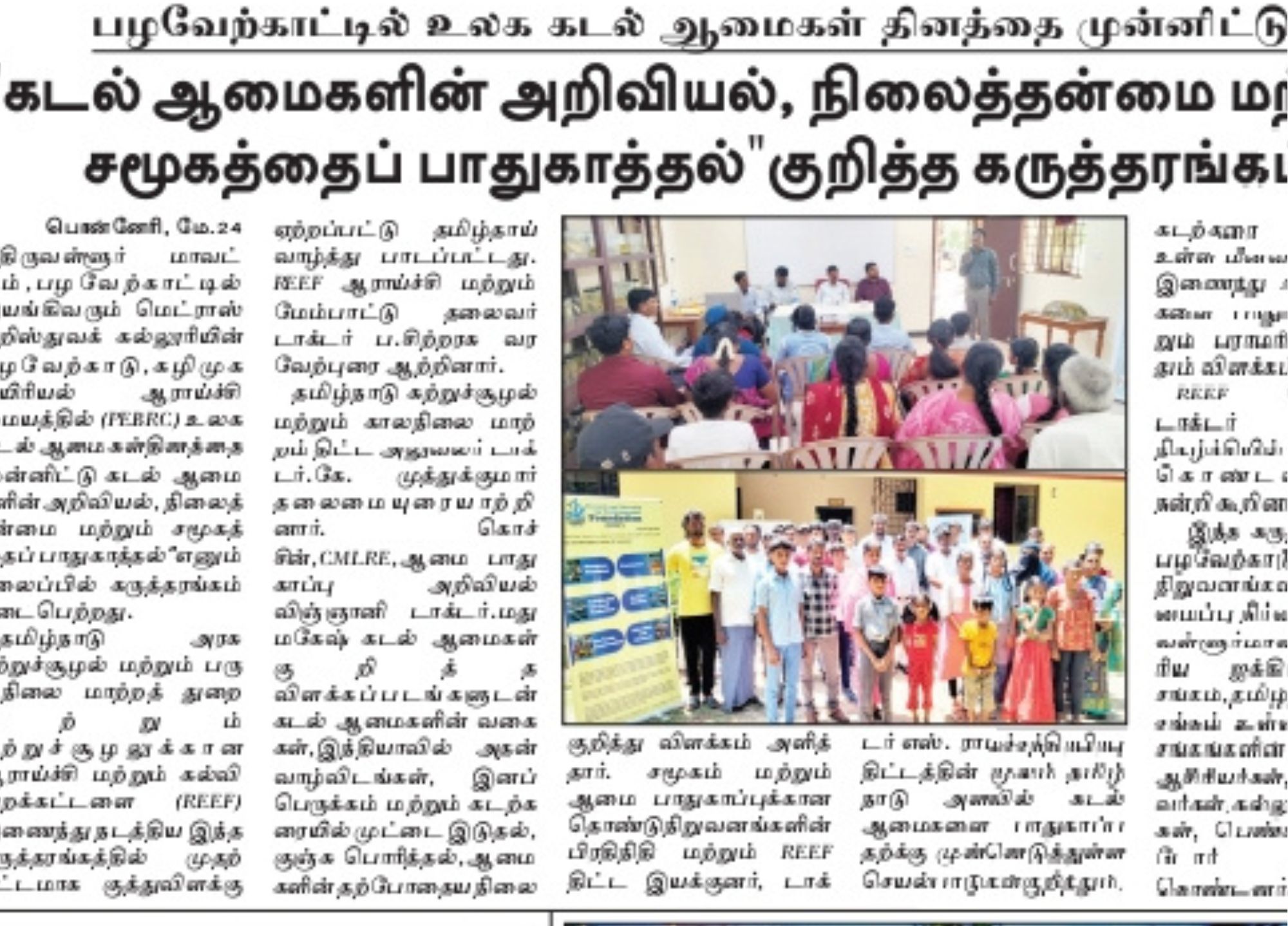 🌊 World Sea Turtle Day Seminar at Pulicat On May 23, 2025, REEF and the Department of Environment and Climate Change held a seminar at PEBRC, MCC on “Science, Sustainability, and Community Protection of Sea Turtles.” The event united researchers, fisherfolk, SHG members, and students to promote marine conservation and community-based turtle protection..
